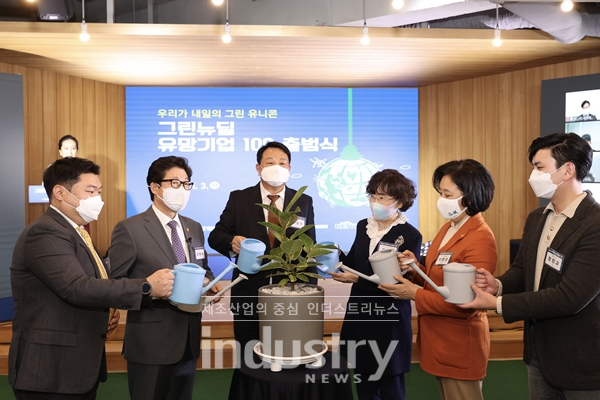 환경부(장관 조명래)와 중소벤처기업부(장관 박영선, 이하 중기부)는 11월 3일, 포스코 체인지업그라운드에서 2020년 ‘그린뉴딜 유망기업 100’ 지원사업에 선정된 41개 기업들을 초청해 이들을 격려하고 현장에서 겪는 어려움과 건의사항을 듣는 출범식을 가졌다고 밝혔다.