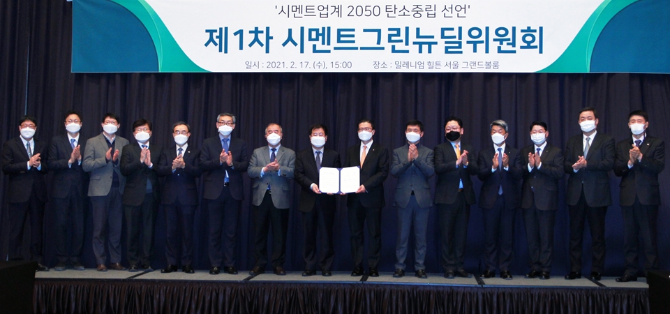 7개 국내 대표 시멘트기업 산학연관 관계자들은 지난 2월 17일 서울 밀레니엄힐튼호텔 그랜드볼룸에 모여 ‘시멘트산업의 2050 탄소중립 추진’을 위한 ‘제1차 시멘트그린뉴딜위원회 출범 및 간담회’를 개최하고, ‘2050 시멘트업계 탄소중립 도전 공동선언문’을 발표했다.