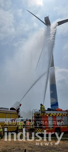 풍력발전기는 타워가 높고 바람의 영향을 많이 받아 화재진압 시 소방차량 전개에 어려움이 따르고, 날개 낙하에 따른 2차 사고의 위험성 또한 크다. 이날 훈련은 이런 문제점에 대응하기 위해 기존 소화 방수 도달 거리보다 원거리 방수가 가능한 특수차량이 동원됐다.