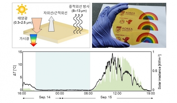 [인더스트리뉴스 권선형 기자] POSTECH은 기계공학과·화학공학과 노준석 교수·통합과정 김민경씨·이다솔 박사 연구팀과 고려대 신소재공학과 이헌 교수·손수민씨 연구팀이 근적외선 빛을 반사하는 동시에 대기가 투명한 구간인 파장 8~13마이크로미터(μm) 구간에서는 열을 방사하는 투명 복사 냉각 소재를 개발했다고 지난 7월 5일 밝혔다.