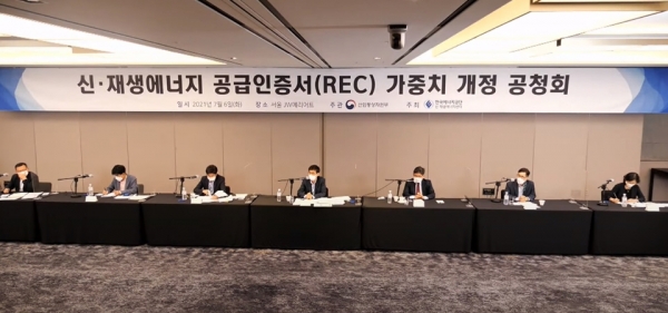 [인더스트리뉴스 권선형 기자] ‘신재생에너지 공급의무화제도 및 연료 혼합의무화제도 관리운영지침 일부개정안’이 지난 6월 30일 행정예고된 가운데, 이와 관련한 ‘신재생에너지 공급인증서(REC) 가중치 개정을 위한 공청회’가 7월 6일 서울 JW 메리어트 호텔에서 마련됐다.