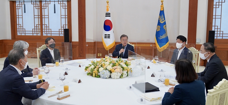 문 대통령은 7일, 청와대 본관에서 한국판 뉴딜 관련 민간분야 유공자와 전문가를 청와대로 초청해 오찬 간담회를 개최했다. 이날 간담회는 문 대통령이 직접 주재해 한국판 뉴딜과 관련한 현장 경험담을 듣고 성공사례를 공유하는 등 성과를 정리했다.