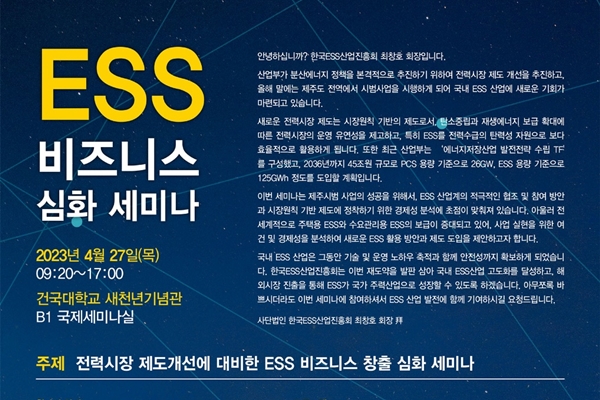 [인더스트리뉴스 최용구 기자] ‘전력시장 제도개선에 대비한 ESS 비즈니스 창출’에 관한 세미나가 4월 27일 건국대학교 새천년기념관 지하 1층 국제세미나실에서 9시20분부터 열린다.
