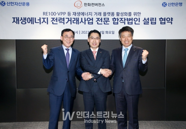 한화컨버전스는 신한자산운용(대표 김희송)과 ‘재생에너지 전력거래를 위한 합작법인(JV) 설립 업무협약’을 체결했다고 5일 밝혔다. 지난 4일 오전 서울 여의도 신한투자증권타워에서 진행된 업무협약식에는 한화컨버전스 김창연 대표, 신한자산운용 김희송 대표 등이 참석했다.
