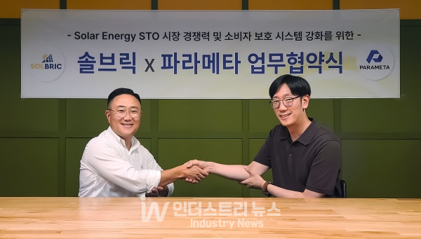 [인더스트리뉴스 최용구 기자] 파라메타(PARAMETA, 대표 김종협)가 솔브릭코리아(SOLBRIC, 대표 강제원)와 ‘태양광 발전소 토큰증권 플랫폼’ 구축을 위한 업무협약을 체결했다고 8일 밝혔다.