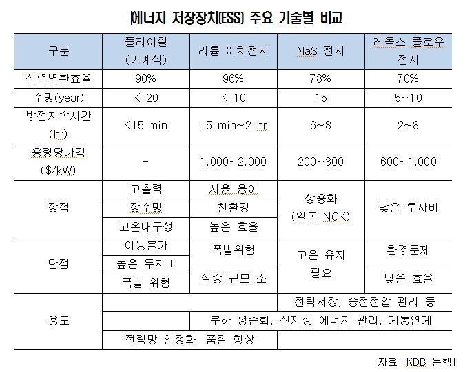 현재 ESS는 리튬 이차전지, NaS전지, 레독스 플로우 전지 등의 전지 방식, 위치에너지를 이용한 양수발전 방식, 플라이휠(Flywheel)을 이용한 기계식 방식이 있지만, 이 중 리튬 이차전지가 높은 에너지 밀도, 높은 에너지 효율, 용량 변화 편의성 등의 장점으로 ESS용으로 선호 되고 있다.