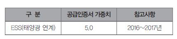 ESS 설비는 전기사업법 제7조 제1항에 따른 발전사업 허가 단위의 공급인증서 발급대상 설비로부터 전력을 공급받아 저장하고 계통으로 전력을 공급하는 전력저장 설비로서, 축전지, 전력변환장치(PCS), 운영시스템(PMS), 계통연계 설비 등으로 구성된 설비를 말한다. 축전지와 전력변환장치(PCS)는 ‘고효율에너지기자재 보급촉진에 관한 규정’에 따른 제품을 사용해야 한다. ESS 설비의 가중치는 공급인증서 발급대상 설비확인 신청일에 속한 연도를 기준으로 적용하여야 하며, 다음 각 호의 사항을 모두 만족해야 한다.