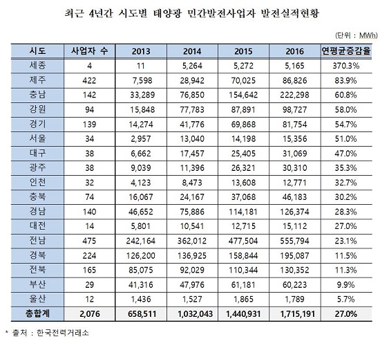 2016년을 기준으로 전남은 민간발전사업자가 광역자치단체 중 475개 업체로 가장 많았고, 55만5,794Mwh의 실적을 내 가장 높은 발전실적을 보였다. 이어서 충남이 22만2,298Mwh, 경북이 19만5,087Mwh으로 뒤를 이었다. 가장 높은 연평균 증가율(83.9%)을 보인 제주는 민간발전사업자가 422개 업체로 광역자치단체 중 두 번째 많았지만, 발전실적은 6번째인 8만6,826Mwh를 기록했다.