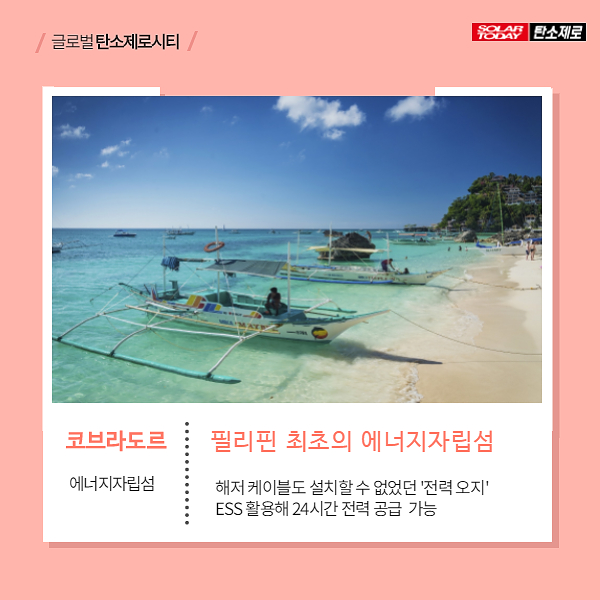 코브라도르는 필리핀 최초의 에너지자립섬이다. 전기가 전혀 공급되지 못하는 필리핀의 유인도 수가 200여개에 달하는 것과 비교하면 대단한 결과다. 코브라도르는 워낙 깊은 수심으로 해저 케이블도 설치할 수 없었던 전력 오지였다. 그러나 태양광 패널, 에너지저장장치인 ESS 등을 활용해 24시간 전력 공급이 가능한 에너지자립섬이 됐다.