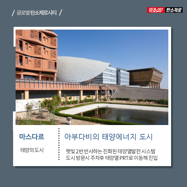 마스다르시티는 아랍에미리트의 대표적인 탄소제로시티로 태양에너지로 움직이는 거대한 친환경 도시로 유명하다. 마스다르시티에서는 화석연료를 사용하는 내연기관 자동차의 운행이 금돼 있다. 도시 방문을 위해서 북단의 대교모 주차장에 차를 세우고 전용도로를 달리는 자율주행 무인괘도 자동차(PRT)를 이용해야 한다. 마스다르시티의 랜드마크는 태양열발전 시스템인 ‘빔다운 솔라 타워’다. 기존의 태양열발전 시스템과 달리 햇빛을 2번 반사하는 구조다. 좁은 지점에 햇빛을 집중적으로 모을 수 있어 매우 높은 열효율을 나타낸다.