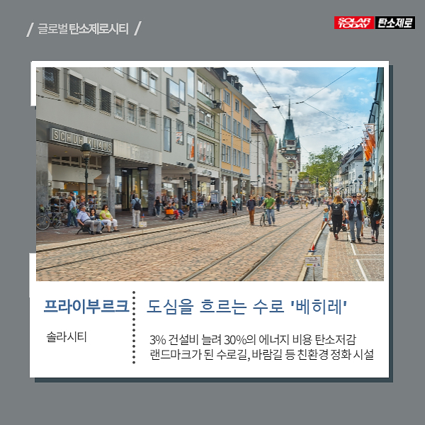 프라이부르크는 독일 남부 도시로 순환 수로와 바람 통로 등 친환경 도시 설계가 잘 이뤄져 있다. 총 길이가 8.9km에 달하는 도시 내부 수로인 ‘베히레’는 도시 내부의 온도를 조절할뿐만 아니라 프라이부르크의 대표적인 이미지로 자리매김하고 있다. 또한, 건물의 높이와 건물 사이의 간격을 규제해 도시의 바람길을 조성함으로써 신선한 공기를 도심부로 끌어들이고 도심의 오염된 대기를 분산시킨다. 가장 눈에 띄는 것은 독일의 ‘10만 지붕 태양에너지 프로그램’ 실시에 더해 프라이부르크에서는 태양열 집열판을 지원하고 있다. 이를 통해 태양광 연립주택 단지가 조성되기도 했다.