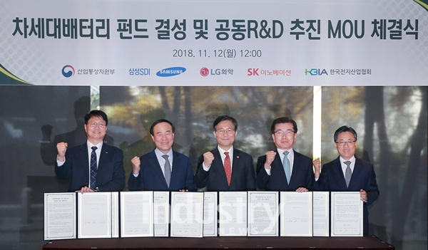 [인더스트리뉴스 이건오 기자] 성윤모 산업통상자원부 장관은 11월 12일, 국내 이차전지 3개 기업 대표가 참석한 가운데 ‘차세대배터리 펀드 결성과 공동 연구개발(R&D) 협력 양해각서(MOU) 체결식’과 ‘업계 간담회’를 진행했다.