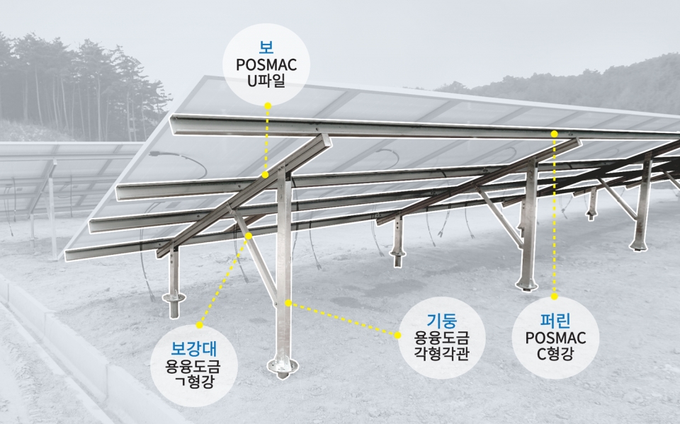 쏠라렉스에서 공급 중인 태양광 구조물의 형태를 살펴보면, 구조물 기둥은 용융도금 각형각관, 보강대는 용융도금 ㄱ형강, 보는 U파일(포스맥), 퍼린은 포스맥 C형강으로 구성된다. 기둥 표면에 처리된 용융아연도금은 지면과 맞닿아 있기 때문에 습기를 고려해 용융아연도금을 70㎛ 두께 이상으로 도막처리해 제공하고 있다.