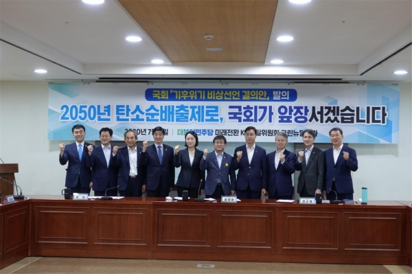 그린뉴딜분과위원장인 김성환 의원(서울 노원 병, 더불어민주당)은 이날 현재의 상황이 기후위기 비상상황임을 선언하고, 국회에 기후위기대응특별위원회를 설치해 2050년 탄소순배출제로 사회를 위해 국회와 정부가 법제도 개선 등 입법적정책적 노력에 적극 협력하기로 한 ‘기후위기 비상선언 결의안’을 대표 발의했다.