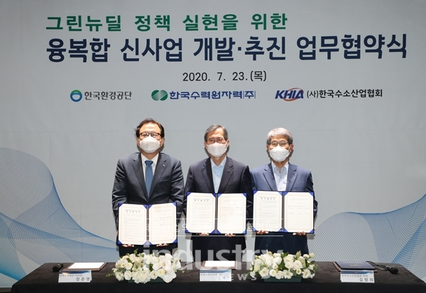 [인더스트리뉴스 이건오 기자] 한국수력원자력(사장 정재훈, 이하 한수원)이 7월 23일, 서울 메리어트호텔에서 환경부 산하 한국환경공단(이사장 장준영), 한국수소산업협회(회장 김방희)와 그린뉴딜 실현을 위한 ‘융복합 신사업 공동협력 업무협약(MOU)’을 체결했다고 밝혔다.