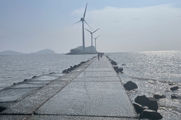 [인더스트리뉴스 정한교 기자] 탄도항 앞 누에섬 인근 해상에 750kW급 풍력발전기 3기가 발전하고 있다.